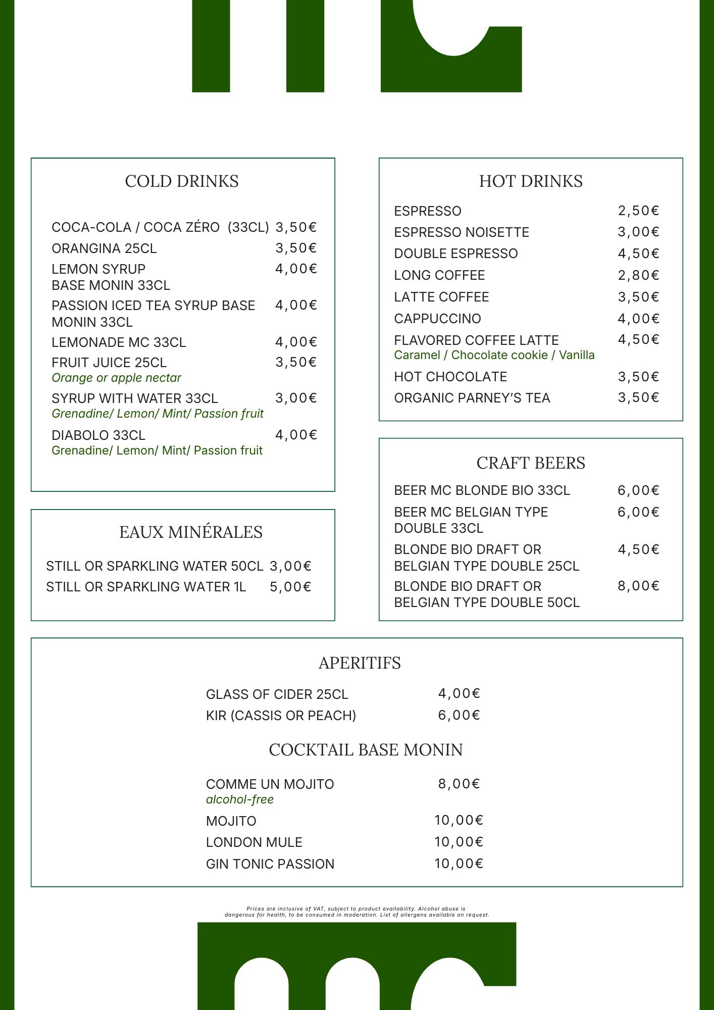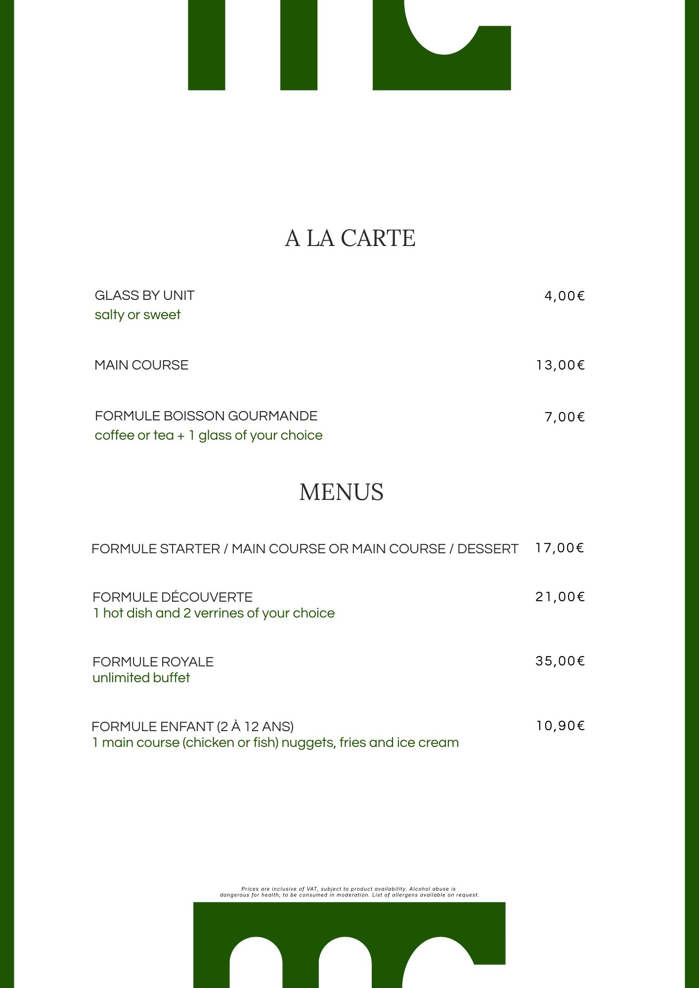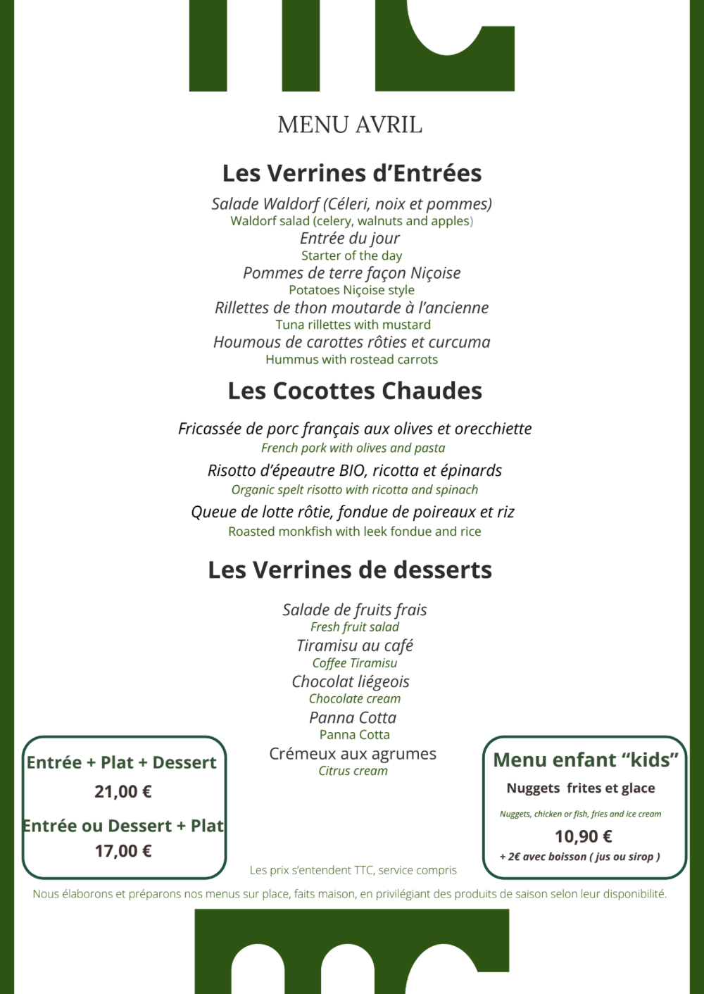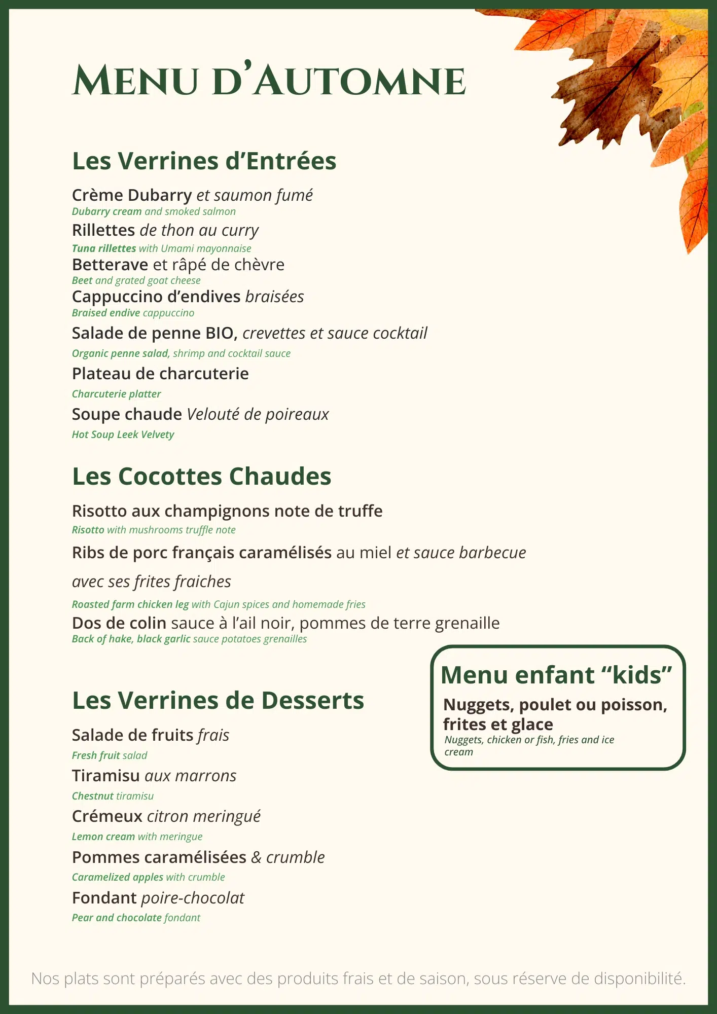 In a bucolic setting with exotic nuances, enjoy our seasonal verrines and cocottes offered in buffet style. There’s something for everyone… even the little ones, thanks to our children’s menu with its unmissable fries and surprise dessert.
