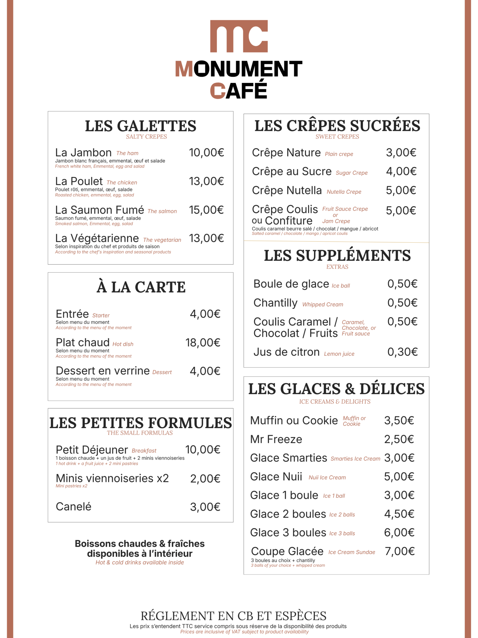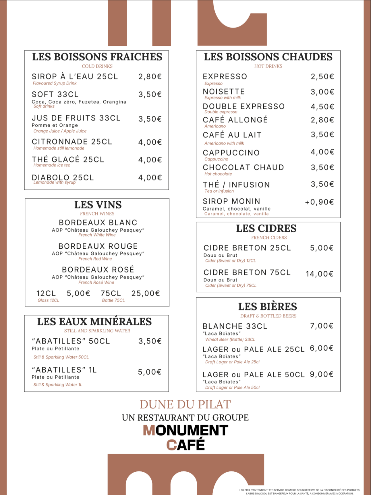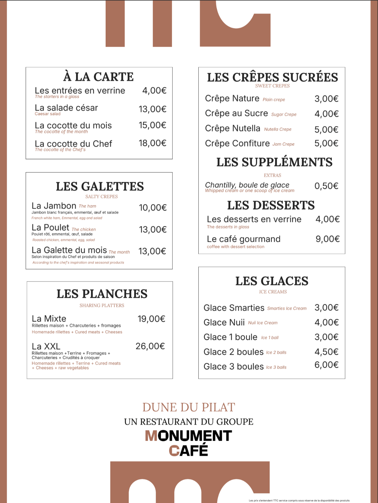Depuis le 12 juin 2023, Monument Café a pris de la hauteur et s’est installé au cœur du nouvel espace d’accueil aménagé aux abords de la Dune. Une nouvelle aventure, et une possibilité pour chacun de déguster les incontournables de la cuisine revisités sous la forme de verrines et de cocottes. Alors avant l’ascension, ou après la descente, venez vous restaurer autour d’un déjeuner buffet, ou bien arrêtez-vous pour une pause gourmande. Notre équipe se fera un plaisir de vous recevoir tout au long de la journée !