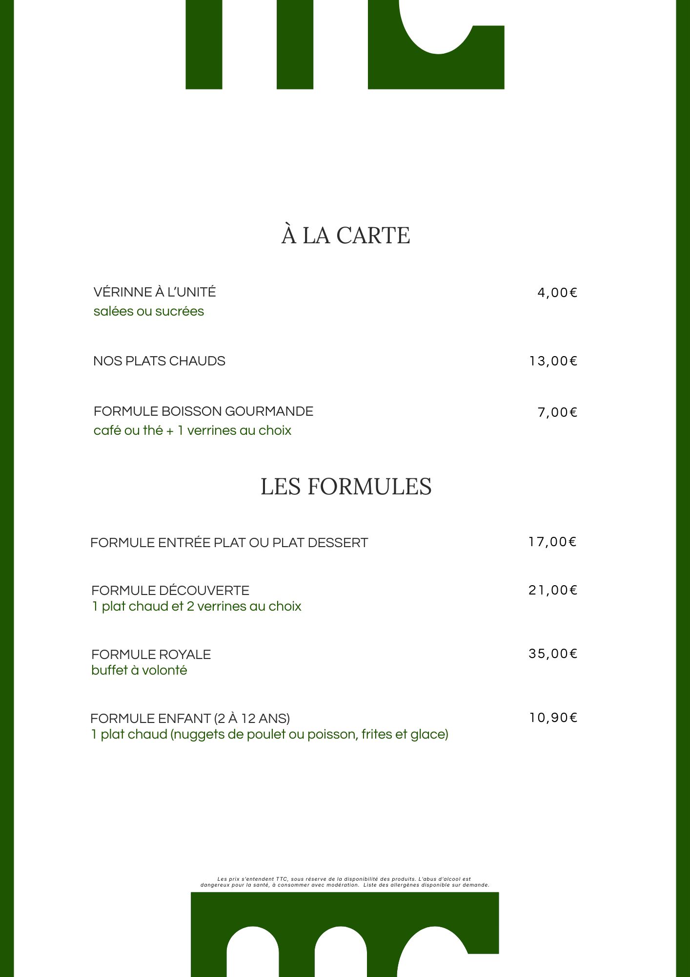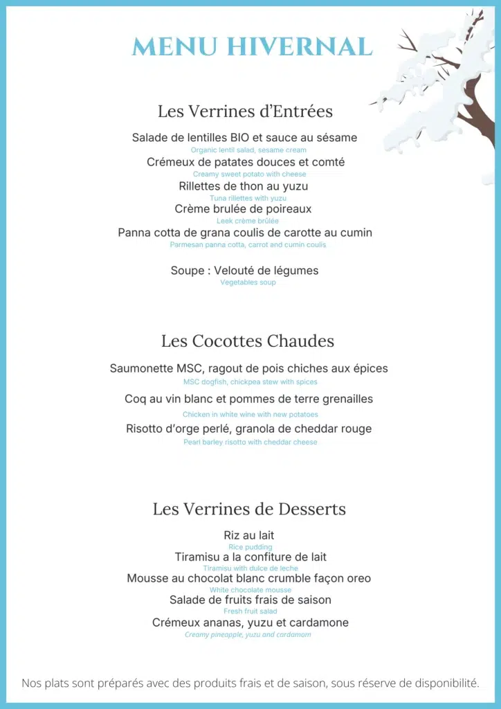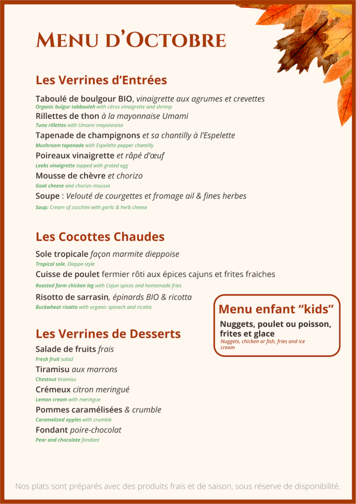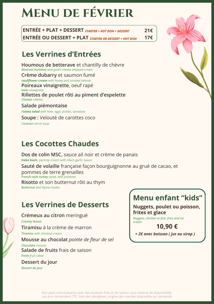 Dans un décor bucolique aux nuances exotiques, dégustez nos verrines et cocottes de saison proposées en formule buffet. Il y en a pour tous les goûts… même pour les petits, grâce à notre menu enfant avec ses incontournables frites et sa surprise au dessert.